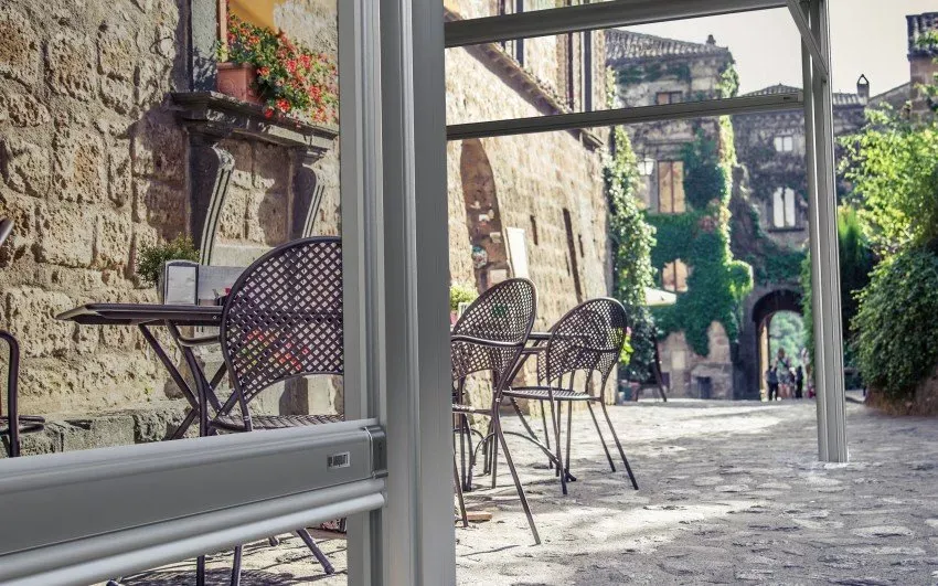 Le chiusure verticali sono poi dotate di un meccanismo di compensazione a molla per le guide che le consentono di assorbire le sollecitazioni subite dai teli a causa, ad esempio, del vento.